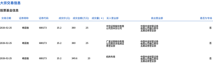 2月25日,希荻微大宗交易成交73万股,成交额1109.6万元,占当日总成交额的6.36%,成交价15.2元, 较市场收盘价16.85元折价9.79%。 | 交易日期 | 证券简称 | 证券代码 | | | 成交价(元) 成交金额(万元) 成交量( *) 买入营业部 | | 卖出营业部 | 是否为专场 | | | --- | --- | --- | --- | --- | --- | --- | --- | --- | --- | | 2026-02-25 | 希获微 | 688173 | 15.2 | 380 | 25 | 空筒系列分公司 | 都能 | | Ka | | 2026-02-25 | 希薇微 | 688173 | 15.2 | 380 | 25 | 色型是送球增值 | 有限公司的通常 | | KI | | 2026-02-25 | 希获微 | 688173 | 15.2 | 349.6 | 23 | 机构专用 | 早日早餐店加盟店 | | Ka | ...