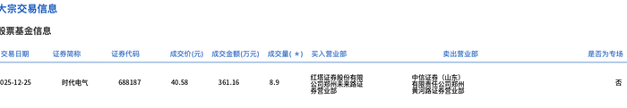 12月25日,时代电气大宗交易成交8.9万股,成交额361.16万元,占当日总成交额的2.76%,成交价40.58 元,较市场收盘价50.82元折价20.15%。 | 区景色运 日心 | | | | | | | | | --- | --- | --- | --- | --- | --- | --- | --- | | 交易日期 | 证券简称 | 证券代码 | 成交价(元) 成交金额(万元) 成交量( * ) 买入营业部 | | | 卖出营业部 | 是否为专场 | | 025-12-25 | 时代电气 | 688187 | 40.58 361.16 | 8.9 | 公里產型美國露露 | 甜點,漫 | ка | ...