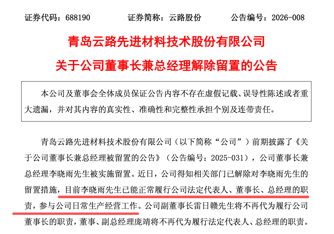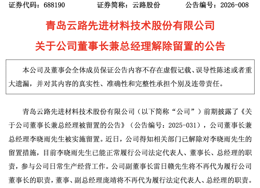 本公司及董事会全体成员保证公告内容不存在虚假记载、误导性陈述或者重大遗漏,并对其内容的真实 性、准确性和完整性承担个别及连带责任。 青岛云路先进材料技术股份有限公司(以下简称"公司")前期披露了《关于公司董事长兼总经理被留置 的公告》(公告编号:2025-031),公司董事长兼总经理李晓雨先生被实施留置。近日,公司得知相关 部门已解除对李晓雨先生的留置措施,目前李晓雨先生已能正常履行公司法定代表人、董事长、总经理 的职责,参与公司日常生产经营工作。公司副董事长雷日赣先生将不再代为履行公司董事长的职责,董 事、副总经理庞靖将不再代为履行法定代表人、总经理的职责。 公司指定信息披露媒体为《中国证券报》《证券时报》《证券日报》《上海证券报》和上海证券交易所 网站(www.sse.com.cn),公司发布的信息均以在上述媒体刊登的公告为准。敬请广大投资者理性投 资,注意投资风险。 特此公告。 青岛云路先进材料技术股份有限公司董事会 登录新浪财经APP 搜索【信披】查看更多考评等级 证券代码:688190 证券简称:云路股份 公告编号:2026-008 青岛云路先进材料技术股份有限公司 关于公司董事长兼总经理解除留置的 ...