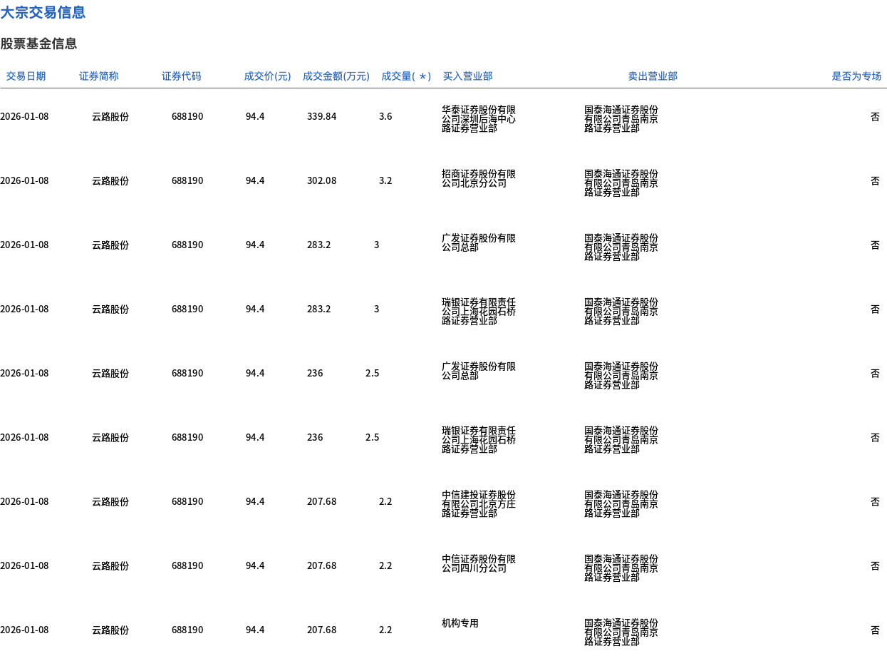 | 交易日期 | 证券简称 | 证券代码 | 成交价(元) | 成交金额(万元) | 成交量(*) | 买入营业部 | 卖出营业部 | | --- | --- | --- | --- | --- | --- | --- | --- | | 2026-01-08 | 云路股份 | 688190 | 94.4 | 339.84 | 3.6 | | | | 2026-01-08 | 云路股份 | 688190 | 94.4 | 302.08 | 3.2 | 招商证券股份有限 公司北京分公司 | | | 2026-01-08 | 云路股份 | 688190 | 94.4 | 283.2 | 3 | 人互联签版份有限 | | | 2026-01-08 | 云路股份 | 688190 | 94.4 | 283.2 | 3 | 公司上海北國足球 瑞德 | | | 2026-01-08 | 云路股份 | 688190 | 94.4 | 236 | 2.5 | 人 友 生 分 分 。 公 。 公 , 。 公 , 。 公 , , 。 公 , , 。 。 。 。 。 。 。 。 。 。 。 。 。 。 。 。 。 。 。 。 。 ...