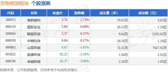 证券之星消息,10月14日生物柴油板块较上一交易日下跌0.49%,卓越新能领跌。当日上证指数报收于 3865.23,下跌0.62%。深证成指报收于12895.11,下跌2.54%。生物柴油板块个股涨跌见下表: 以上内容为证券之星据公开信息整理,由AI算法生成(网信算备310104345710301240019号),不构成 投资建议。 从资金流向上来看,当日生物柴油板块主力资金净流出1429.91万元,游资资金净流出532.76万元,散户 资金净流入1962.68万元。生物柴油板块个股资金流向见下表: | 代码 | 名称 | 主力净流入(元) | 主力净占比 游资净流入 (元) | | 游资净占比 散户净流入 (元) | | 散户净占比 | | --- | --- | --- | --- | --- | --- | --- | --- | | 300072 海新能科 | | 2256.89万 | 7.36% | 304.06万 | 0.99% | -2560.96万 | -8.35% | | 000159 国际实业 | | -286.21万 | -2.41% | -984.43万 | -8.28% | 1270 ...