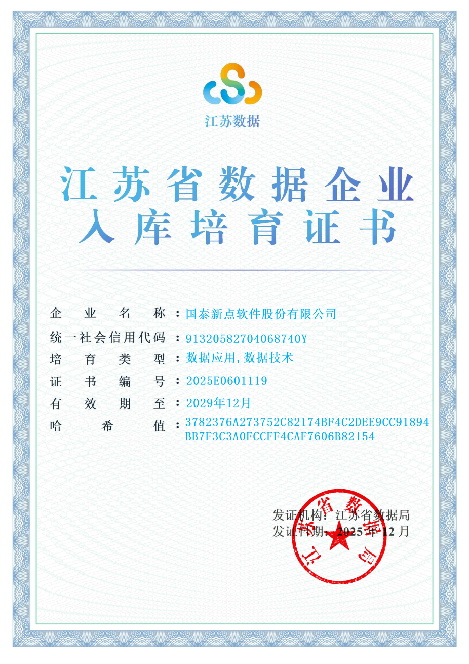 近日,江苏省数据局正式发布江苏省第一批入库培育数据企业名单。经过多轮严格筛选与综合评审,新点软件凭借在数据领域的深 厚积累与综合技术实力成功入选,获评"数据应用""数据技术"培育资质,标志着企业在数据创新与实践方面获得省级权威认可。 数据企业是数据产业发展的"主力军",未来,新点软件将以此次入选为契机,深化智慧招采、智慧政务、数字建筑三大业务领域的 数据赋能能力,携手客户伙伴共同探索数据价值实现的新路径,致力于为国家和省级数据产业发展贡献实践经验与创新成果。 | 企 业 名 称 :国泰新点软件股份有限公司 | | --- | | 统一社会信用代码 : 91320582704068740Y | | 培 育 类 型:数据应用,数据技术 | | 证 书 编 号:2025E0601119 | | 有 效 期 至 : 2029年12月 | | 希 · 3782376A273752C82174BF4C2DEE9CC91894 哈 | 发i 发 BB7F3C3A0FCCFF4CAF7606B82154 江苏省数据企业入库培育工作,是省数据局为贯彻落实《江苏省数据条例》等政策部署、繁荣数据产业生态推出的重要举措,评审 维度覆 ...