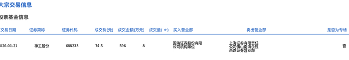 1月21日,神工股份大宗交易成交8万股,成交额596万元,占当日总成交额的0.63%,成交价74.5元,较 市场收盘价87.09元折价14.46%。 | 1717 14.10 | | --- | | 区景壁立日记 | | 交易日期 证券简称 | | 证券代码 | 成交价(元) 成交金额[万元) 成交量(*) 买入营业部 | | | 卖出营业部 | 是否为专场 | | --- | --- | --- | --- | --- | --- | --- | --- | | 026-01-21 | 神工股份 | 688233 | 74.5 596 | | 因海证券嚴盤有限 | 去費電器買獲 | 超 | ...