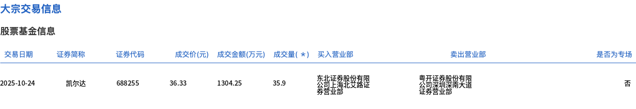 Group 1 - On October 24, a block trade of Kailida involved 359,000 shares with a transaction value of 13.0425 million yuan, accounting for 17.37% of the total trading volume for the day [1] - The transaction price was 36.33 yuan, which was consistent with the market closing price of 36.33 yuan [1] - The buying brokerage was Tai Bei Securities, while the selling brokerage was Yue Kai Securities [2]