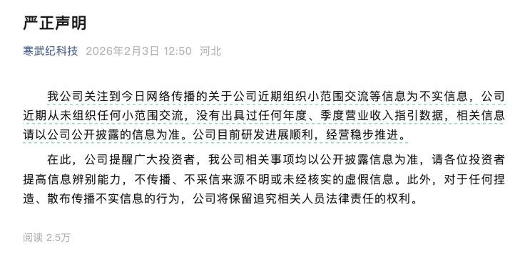 星标 ★ IPO日报 精彩文章第一时间推送 2026年2月2日,2月的第一个交易日,"寒王"(寒武纪,688256)的股价一点也不兴奋,和其业绩表现相差甚远。 当日,寒武纪以1249元的价格低开,盘中冲高回落再拉冲高,盘中最高价1273元,最低价1233元,收盘价1242元,下跌1.34%。从阶段性高点 1550元开始,15个交易日下跌超过300元,形成了新一波下杀走势,目前已跌破30日、60日线,尚未看到止跌的信号。 张力制图 笔者以为,2025年对寒武纪而言,应该说值得是载入公司发展史的一年。根据其最新发布的业绩预告,预计2025年营收为60亿-70亿元,归母净 利润18.5亿-21.5亿元。 这意味着公司自成立以来首次实现年度盈利,标志着这家AI芯片龙头企业跨过了从技术积累到商业变现的关键门槛。 我们来简单计算一下,如果以营收中值65亿元、净利润中值20亿元计算,寒武纪2025年净利润率约30.8%,这一指标可谓相当优秀,远超国内多 数芯片设计公司,甚至可与国际领先的半导体巨头媲美。 笔者以为,寒武纪之所以能实现盈利,主要是有两个方面:一是营收大规模增长,2024年,寒武纪的营收为11.7亿元,现在最高 ...