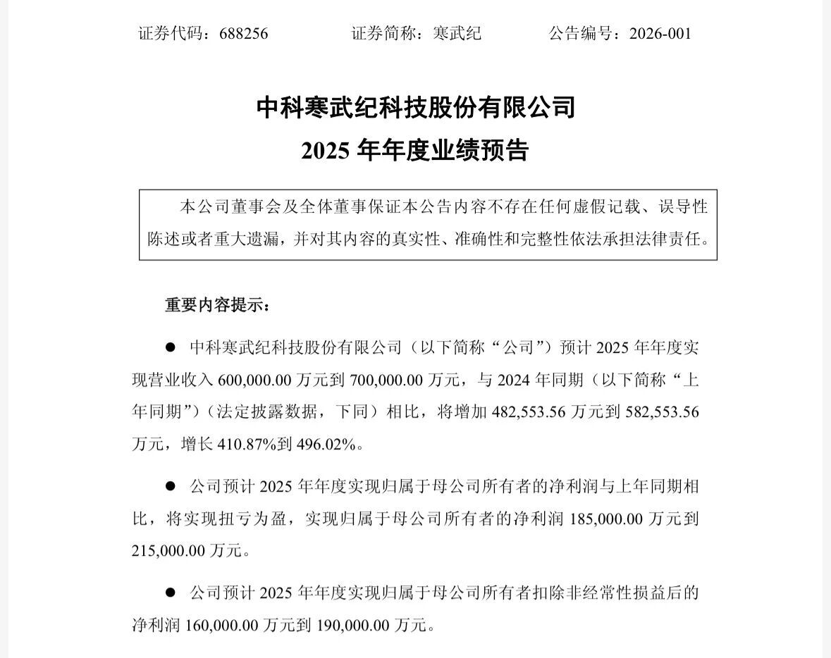 今日晚间重要公告抢先看——寒武纪:2025年预盈18.5亿元—21.5亿元;中际旭创:2025年净利同比预增89.50%-128.17%