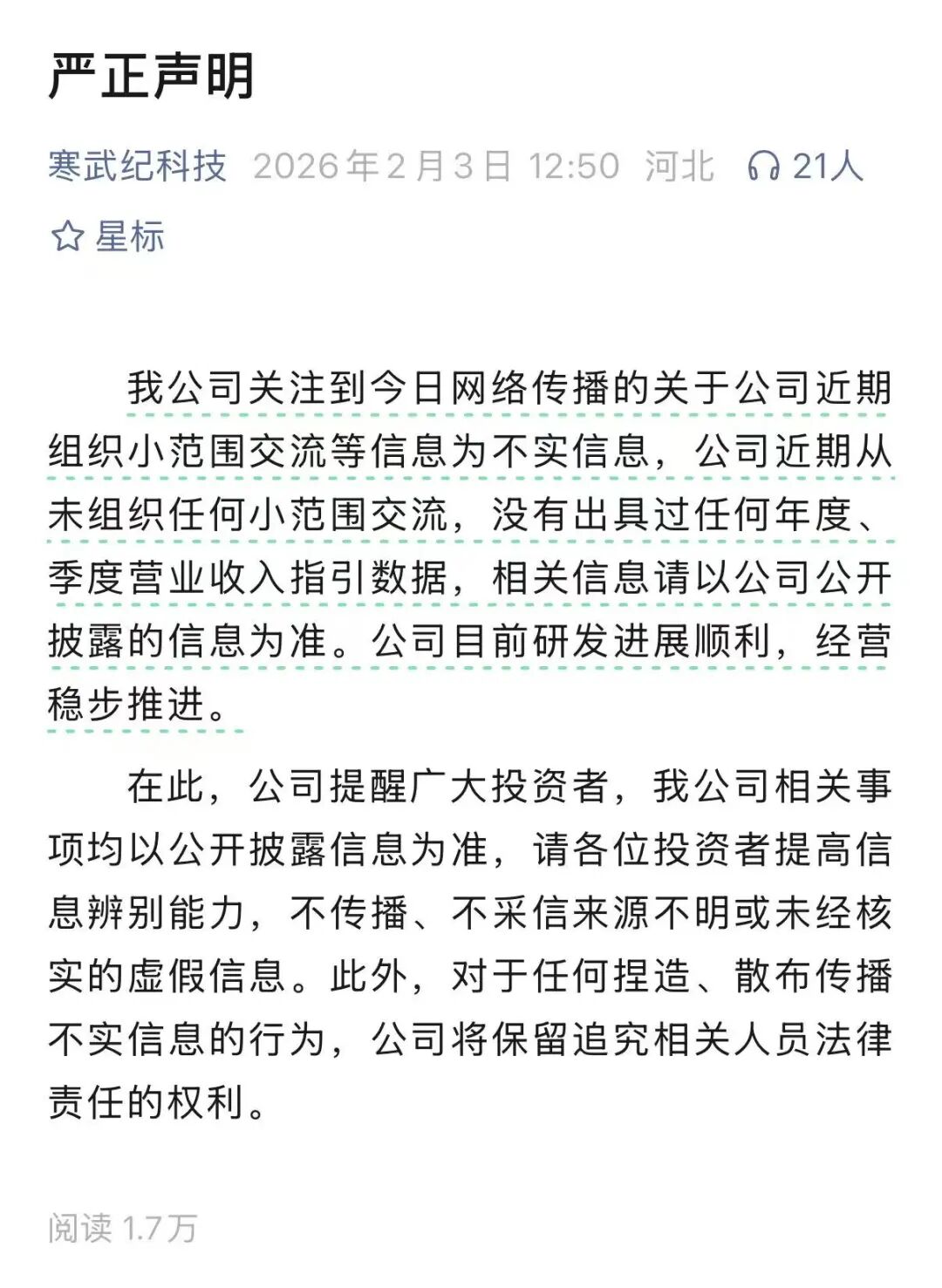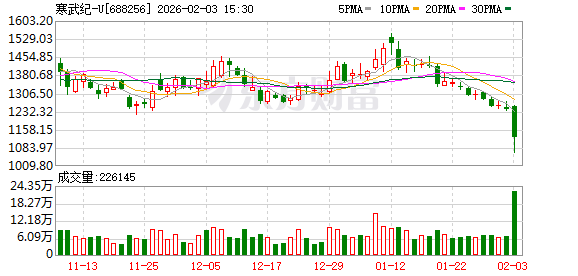 这意味着公司自成立以来首次实现年度盈利,标志着这家AI芯片龙头企业跨过了从技术积累到商业变 现的关键门槛。 然而,与这份亮眼财报形成鲜明对比的是,公司股价在近期却连续下滑,这种基本面与市场表现的背 离,折射出当前市场对寒武纪价值判断的复杂心态与深层逻辑。 炒股就看金麒麟分析师研报,权威,专业,及时,全面,助您挖掘潜力主题机会! 来源:IPO日报 2026年2月2日,2月的第一个交易日,"寒王"(寒武纪,688256)的股价一点也不兴奋,和其业绩表现 相差甚远。 当日,寒武纪以1249元的价格低开,盘中冲高回落再拉冲高,盘中最高价1273元,最低价1233元,收盘 价1242元,下跌1.34%。从阶段性高点1550元开始,15个交易日下跌超过300元,形成了新一波下杀走 势,目前已跌破30日、60日线,尚未看到止跌的信号。 张力制图 笔者以为,2025年对寒武纪而言,应该说值得是载入公司发展史的一年。根据其最新发布的业绩预告, 预计2025年营收为60亿-70亿元,归母净利润18.5亿-21.5亿元。 笔者以为,目前来看,寒武纪的基本面在本质上有了较大的突破:从"烧钱研发"到"规模盈利"转变。 我们来简单计算一 ...