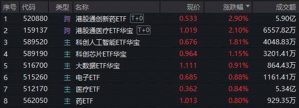 周二(2月10日),A股窄幅震荡,科创板表现亮眼,字节Seedance2.0爆火出圈,AI应用、算力芯片全线活跃,科创人工智能ETF华宝 (589520)场内继续猛攻近2%,科创芯片ETF华宝(589190)场内继续反弹逾1%。 港股方面,医药医疗绝地反弹,创新药纯度100%的港股通创新药ETF(520880)场内摸高3.86%,收涨2.9%收复20日线,放量成交5.9亿元; CXO含量较高的港股通医疗ETF华宝(159137)场内涨2.1%豪取六连阳。 | 序号 代码 | | ਤੇ 2 ਜ 名称 | 现价 | 涨跌幅 | 成交额 | | --- | --- | --- | --- | --- | --- | | 7 | 520880 | 跨 港股通创新药ETF T+0 | 0.533 | 2.90% | 5.90亿 | | 2 | 159137 | 度 港股通医疗ETF华宇 T+0 | 1.019 | 2.10% | 6557.82万 | | 3 | 589520 | 主 科创人工智能ETF华宇 | 0.676 | 1.81% | 4048.83万 | | 4 | 589190 | 主 科创芯片ETF华宇 ...