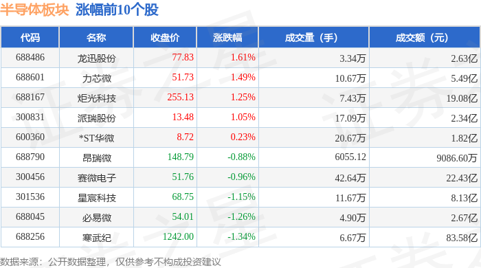 证券之星消息,2月2日半导体板块较上一交易日下跌5.46%,聚辰股份领跌。当日上证指数报收于 4015.75,下跌2.48%。深证成指报收于13824.35,下跌2.69%。半导体板块个股涨跌见下表: | 代码 | 名称 | 收盘价 | 涨跌幅 | 成交量(手) | 成交额(元) | | | --- | --- | --- | --- | --- | --- | --- | | 688486 | 龙迅股份 | 77.83 | 1.61% | 3.34万 | | 2.63亿 | | 688601 | 力心微 | 51.73 | 1.49% | 10.67万 | | 5.49亿 | | 688167 | 炬光科技 | 255.13 | 1.25% | 7.43万 | | 19.08亿 | | 300831 | 派瑞股份 | 13.48 | 1.05% | 17.09万 | | 2.34亿 | | 600360 | *ST华微 | 8.72 | 0.23% | 20.67万 | | 1.82亿 | | 688790 | 昂瑞微 | 148.79 | -0.88% | 6055.12 | | 9086.60万 | | ...