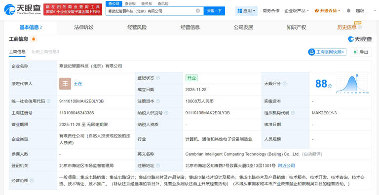 寒武纪在北京成立智算科技公司 注册资本1亿