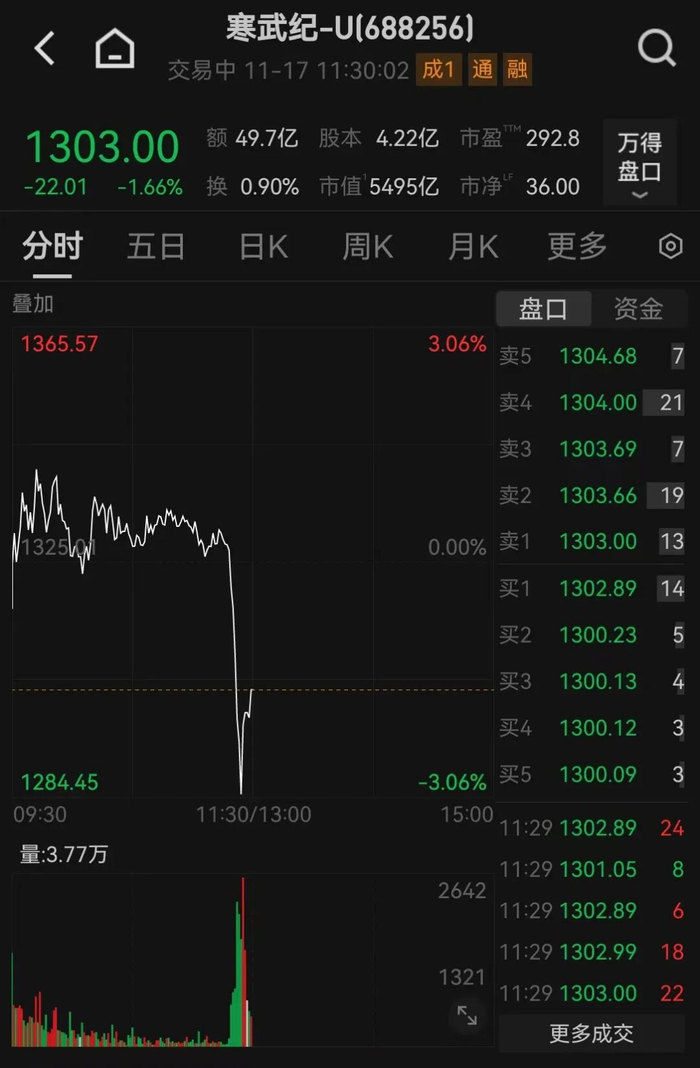 编 辑丨瑜见 11月17日,寒武纪小幅低开,盘中窄幅震荡,临近午间收盘,该股股价突然直线跳水,一度跌逾3%。 截至午间收盘,跌1.66%,报1303元,成交额近50亿元。 ...