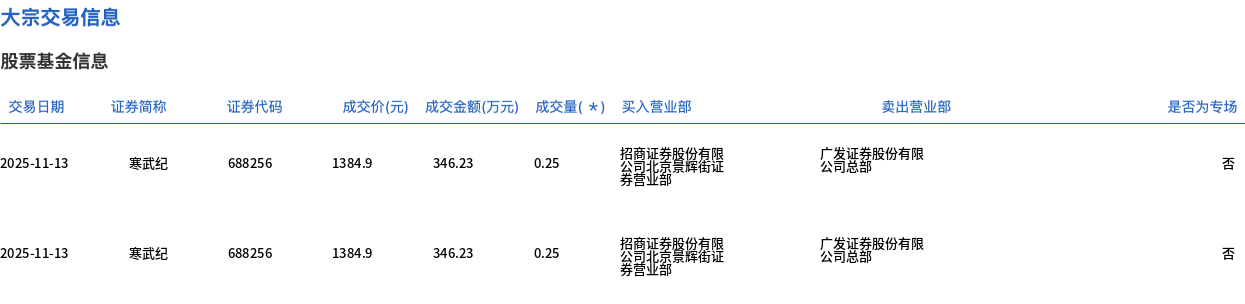 11月13日,寒武纪大宗交易成交5000股,成交额692.46万元,占当日总成交额的0.08%,成交价1384.9元,较市场收盘价1384.9元持平。 | 交易日期 | 证券简称 | 证券代码 | 成交价(元) | 成交金额(万元) 成交量( * ) 买入营业部 | | | 卖出营业部 | | --- | --- | --- | --- | --- | --- | --- | --- | | 2025-11-13 | 寒武纪 | 688256 | 1384.9 | 346.23 | 0.25 | 発電亦設 花園北臺灣時望薩 | 广发证券股份有限公司总部 | | 2025-11-13 | 寒武纪 | 688256 | 1384.9 | 346.23 | 0.25 | 案量 公司北章嘉祥智遊 | 广发证券股份有限公司总部 | ...