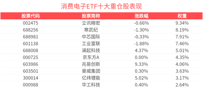 消费电子ETF紧密跟踪中证消费电子主题指数,中证消费电子主题指数选取50只业务涉及元器件生产、 整机品牌设计及生产等消费电子相关的上市公司证券作为指数样本,以反映消费电子主题上市公司证券 的整体表现。 数据显示,截至2025年10月31日,中证消费电子主题指数(931494)前十大权重股分别为立讯精密 (002475)、寒武纪(688256)、工业富联(601138)、中芯国际(688981)、澜起科技(688008)、京东方 A(000725)、兆易创新(603986)、豪威集团(603501)、亿纬锂能(300014)、东山精密(002384),前十大权 重股合计占比56.3%。 近期,立讯精密在投资者互动中回复,2025 年,消费电子行业正式迈入由AI驱动的全新创新周期。 AIPC、AI手机、智能声学、智能穿戴等终端产品的加速普及,以及空间计算设备体验的持续优化,共 同激发了新一轮市场热潮。 消费电子单价较低容易起量,有望成为AI应用最先落地的场景之一。人工智能+行动意见对智能终端等 普及率提出具体量化目标(27年70%,30年90%),落地可能大。国内消费电子产业链完善,成为各类 消费电子新品开发的首 ...