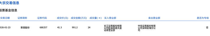| | 证券简称 新锐股份 | 证券代码 688257 | 成交价(元) 成交金额[万元) 成交量(*) 买入营业部 991.2 24 41.3 | 公司还喜嚣黎契盟 | 去筒플類簡寫有限 | 卖出营业部 | 是否为专场 ко | | --- | --- | --- | --- | --- | --- | --- | --- | | 交易日期 026-01-23 | | | | | | | | 1月23日,新锐股份大宗交易成交24万股,成交额991.2万元,占当日总成交额的2.78%,成交价41.3 元,较市场收盘价53.19元折价22.35%。 ...