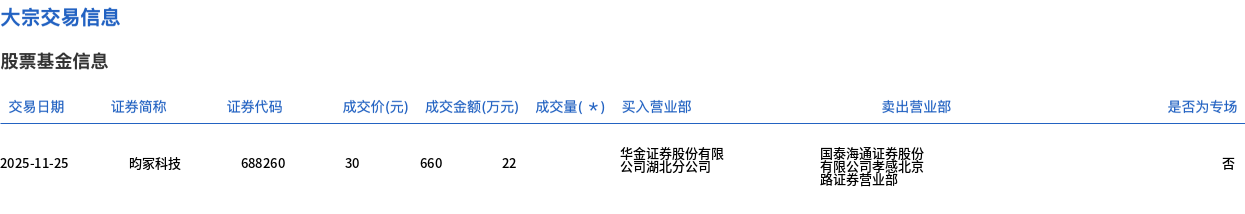 11月25日,昀冢科技大宗交易成交22万股,成交额660万元,占当日总成交额的1.83%,成交价30元,较市场收盘价32.7元折价8.26%。 | | | ...