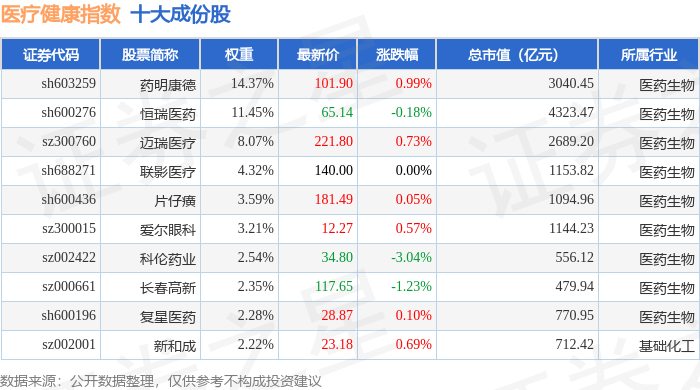 证券之星消息,10月23日,医疗健康(980016)指数报收于6646.6点,跌0.3%,成交199.22亿元,换手 率0.75%。当日该指数成份股中,上涨的有16家,康龙化成以1.55%的涨幅领涨,下跌的有31家,特宝生 物以6.07%的跌幅领跌。 | 代码 | 名称 | 主力净流入(元) | 主力净占比 游资净流入 (元) | | 游资净占比 散户净流入 (元) | | 散户净占比 | | --- | --- | --- | --- | --- | --- | --- | --- | | 300760 迈瑞医疗 | | 6694.79万 | 6.06% | -6333.91万 | -5.73% | -360.88万 | -0.33% | | 688278 | 特宝生物 | 2909.66万 | 6.65% | 1227.72万 | 2.81% | -4137.37万 | -9.45% | | 300015 爱尔眼科 | | 2058.52万 | 4.25% | -2290.46万 | -4.73% | 231.94万 | 0.48% | | 6620008 | 康龙化成 | 1703.62万 | 2.84 ...