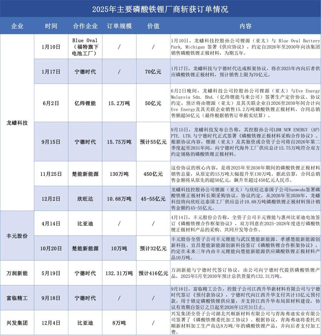 爆单了!2025年磷酸铁锂材料厂商已斩获超321.94万吨订单!