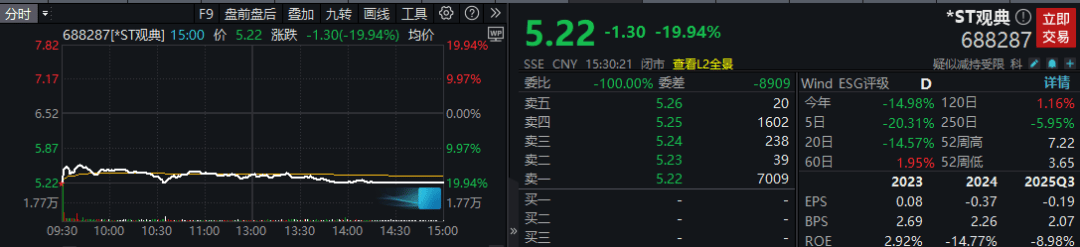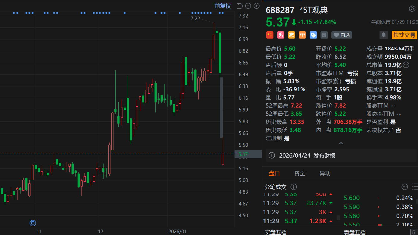 A股异动丨*ST观典大跌17.6%,跌幅居市场首位,年度业绩预亏+可能被终止上市