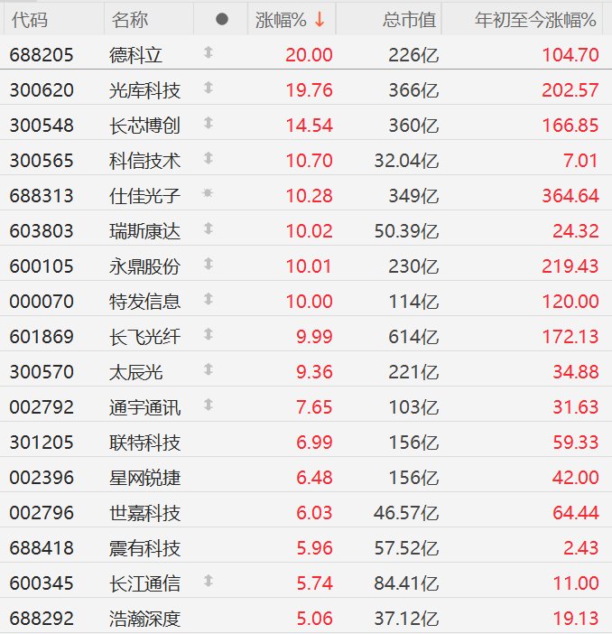 格隆汇11月25日|A股市场通信设备股表现强势,其中,德科立20CM涨停,光库科技逼近20CM涨停, 长芯博创涨超14%,科信技术、仕佳光子涨超10%,瑞斯康达、永鼎股份、特发信息(维权)、长飞光 纤10CM涨停,太辰光涨超9%,通宇通讯涨超7%,联特科技、星网锐捷、世嘉科技涨超6%,震有科 技、长江通信、浩瀚深度涨超5%。 MACD金叉信号形成,这些股涨势不错! | 代码 | 名称 | | 涨幅% ↓ | 总市值 | 年初至今涨幅%。 | | --- | --- | --- | --- | --- | --- | | 688205 | 得料 | 1 | 20.00 | 226亿 | 104.70 | | 300620 | 光库科技 | 1 | 19.76 | 366亿 | 202.57 | | 300548 | 长芯博创 | 1 | 14.54 | 360亿 | 166.85 | | 300565 | 科信技术 | 1 | 10.70 | 32.04亿 | 7.01 | | 688313 | 仕佳光子 | -澳 | 10.28 | 349亿 | 364.64 | | 603803 | 瑞斯康达 | 4 | ...