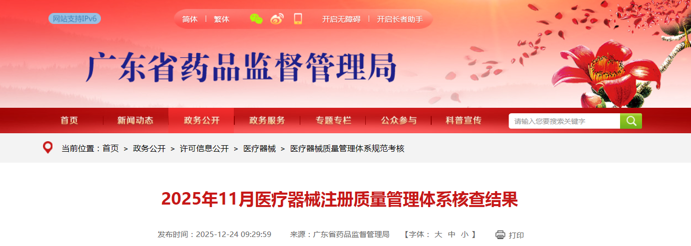 来源:广东省药品监督管理局 tto 63 11 简体 | 繁体 开启无障碍 | 开启长者助手 首页 新闻动态 政务公开 政务服务 公众参与 科普曾传 清绮入 您 当前位置:首页 > 政务公开 > 许可信息公开 > 医疗器械 > 医疗器械质量管理体系规范考核 2025年11月医疗器械注册质量管理体系 发布时间:2025-12-24 09:29:59 | 受理号 | 企业名称 | 产品名称 | 生产地址 | 核查 | 结论日期 | | --- | --- | --- | --- | --- | --- | | | | | | 结论 | | | 广东威诺敦生 | | | | 整改 后通 | | | CQZ2501532 | 物医药科技有 限公司 | 医用臭氧治疗仪 | 佛山市顺德区乐从镇水藤村委会创富六路1号联东科创园8座101、201、301 | 过核 | 2025/11/3 | | | | | | 査 | | | 广东百生医疗 | | | | 整改 后通 | | | CQX2501755 器械股份有限 高频手术设备 | 公司 | | 江门市新会区福盛路11号 | 过核 | 2025/11/3 | | | | | ...