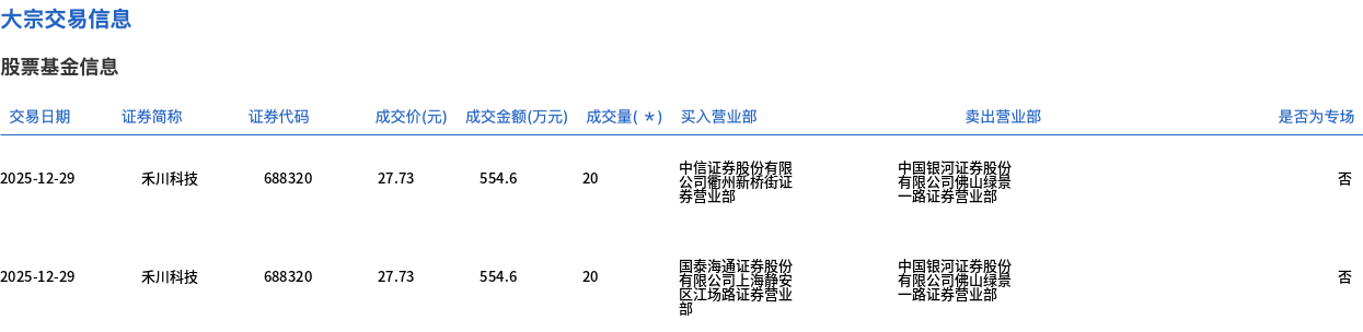 | 交易日期 | 证券简称 | 证券代码 | 成交价(元) 成交金额(万元) 成交量( * ) | | 买入营业部 | | 卖出营业部 | | --- | --- | --- | --- | --- | --- | --- | --- | | 2025-12-29 | 禾川科技 | 688320 | 27.73 20 | 554.6 | 中信证券股份有限 公司衛州新桥街道 年前的 | 中国银河证券股份 | | | 2025-12-29 | 禾川科技 | 688320 | 27.73 20 | 554.6 | 国泰海通业务股份 | 中国银河证券股份 | | 12月29日,禾川科技大宗交易成交40万股,成交额1109.2万元,占当日总成交额的3.92%,成交价27.73元,较市场收盘价36.16元折价23.31%。 ...