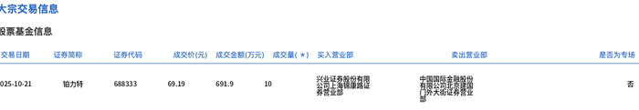 Group 1 - The core transaction involved 100,000 shares of Platinum, with a total transaction value of 6.919 million yuan, representing 2.06% of the total trading volume for the day [1] - The transaction price was 69.19 yuan, which was consistent with the market closing price of 69.19 yuan [1] Group 2 - The transaction occurred on October 21, with the stock code for Platinum being 688333 [2] - The buying brokerage involved in the transaction was identified as "茶堂正素露出習區" [2] - The selling brokerage was noted as "顏類體" [2]