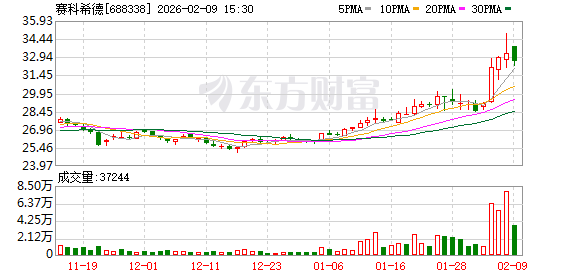 中国经济网北京2月9日讯赛科希德(688338.SH)今日收报32.55元,跌幅2.11%。目前该股处于破发状态。 赛科希德于2020年8月6日在上交所科创板上市,首次发行股份数量为2041.20万股,发行价格50.35元/ 股。上市首日,赛科希德开盘报180.00元,收盘报170.18元,上市首日盘中创下最高价186.00元,为该 股上市以来最高价。 赛科希德募集资金总额为10.28亿元,扣除发行费用后,募集资金净额为9.24亿元。公司最终募集资金净 额较原计划多5.54亿元。2020年7月29日,赛科希德发布的招股说明书显示,公司计划募集资金3.71亿 元,分别用于生产基地建设项目、研发中心建设项目、营销网络建设项目、补充营运资金。 赛科希德的保荐机构为中金公司(601995),保荐代表人为方良润、徐石晏。公司首次上市发行费用为 1.03亿元,其中保荐机构中金公司获得保荐和承销费8532.22万元。 2023年7月1日,赛科希德发布的2022年年度权益分派实施公告显示,公司2022年年度权益分派方案为: 以方案实施前的公司总股本为基数,每股派发现金红利0.26元(含税),以资本公积金向全体股东每股转 增0 ...