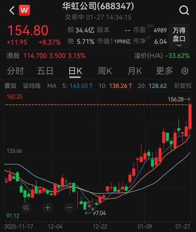 1月27日午后,半导体晶圆代工龙头华虹公司一度涨超9%,股价上扬至156.28元/股,再创历史新高。 ...