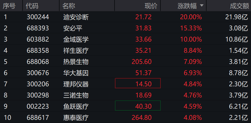全市场规模最大且高脑机含量的医疗器械ETF(159883)午后走强,现上涨1.53%。盘中获资金申购超2.6亿! 截至2026年1月9日 14:05,中证全指医疗器械指数(H30217)强势上涨1.59%,成分股迪安诊断(300244)20CM涨停,金域医学 (603882)10CM涨停,安必平(688393)涨超15%,祥生医疗(688358)、华大基因(300676)等个股跟涨。 资金流入方面,医疗器械ETF近4天获得连续资金净流入,最高单日获得5.17亿元净流入,合计"吸金"12.32亿元,日均净流入 达3.08亿元。 | 序号 | 代码 | 名称 | 现价 | 涨跌幅 ▼ | 成交额 | | --- | --- | --- | --- | --- | --- | | 1 | 300244 | 迪安诊断 | 21.72 | 20.00% | 21.98亿 | | 2 | 688393 | 安必平 | 31.83 | 15.33% | 3.08亿 | | 3 | 603882 | 金域医学 | 33.66 | 10.00% | 10.86亿 | | 4 | 688358 | 祥生医疗 | 35.21 | ...