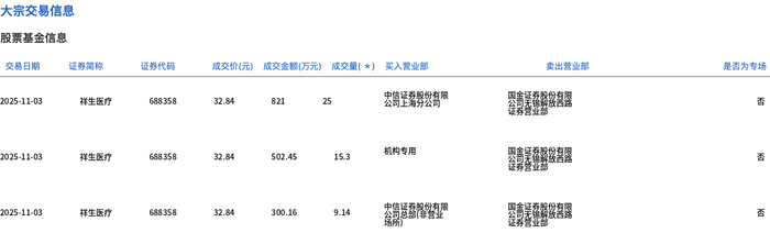 | 交易日期 | 证券简称 | 证券代码 | | | 成交价(元) 成交金额(万元) 成交量(*) 买入营业部 | | 卖出营业部 | 是否为专场 | | --- | --- | --- | --- | --- | --- | --- | --- | --- | | 2025-11-03 | 祥生医疗 | 688328 | 32.84 | 821 | 25 | 中信译费服公有限 | 公司 2018年8月2 | 140 | | 2025-11-03 | 祥生医疗 | 688358 | 32.84 | 502.45 | 15.3 | 机构专用 | 容身主要被思想 | KI | | 2025-11-03 | 祥生医疗 | 688358 | 32.84 | 300.16 | 9.14 | 去筒플露除的型 | 器商量在线路路 | KO | 11月3日,祥生医疗大宗交易成交49.44万股,成交额1623.61万元,占当日总成交额的12.36%,成交价 32.84元,较市场收盘价35.81元折价8.29%。 ...