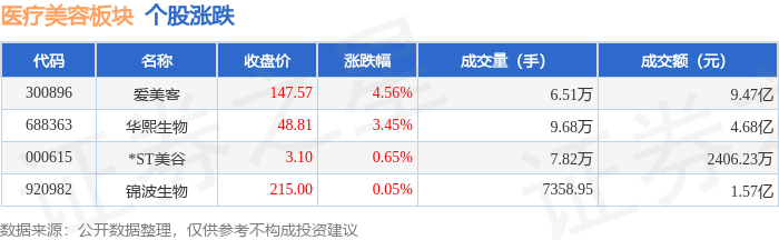 | 代码 | 名称 | 收盘价 | 涨跌幅 | 成交量(手) | 成交额(元) | | | --- | --- | --- | --- | --- | --- | --- | | 688363 | 华熙生物 | 47.18 | 5.24% | 11.82万 | | 5.62 亿 | | 300896 | 爱美客 | 141.14 | 1.01% | 4.75万 | | 6.83 亿 | | 000615 | *ST美谷 | 3.08 | 0.33% | 11.51万 | | 3595.71万 | | 920982 | 锦波生物 | 214.89 | -2.94% | 9949.16 | | 2.17亿 | 从资金流向上来看,当日医疗美容板块主力资金净流入1.0亿元,游资资金净流出4045.64万元,散户资金 净流出5989.44万元。医疗美容板块个股资金流向见下表: 证券之星消息,2月2日医疗美容板块较上一交易日上涨2.68%,华熙生物领涨。当日上证指数报收于 4015.75,下跌2.48%。深证成指报收于13824.35,下跌2.69%。医疗美容板块个股涨跌见下表: | 代码 | 名称 | 主力净流入 (元 ...