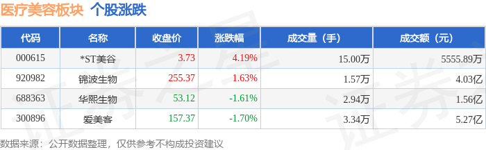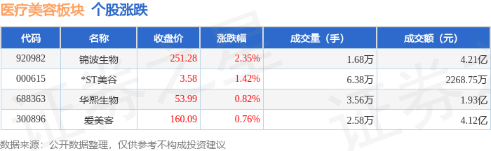 证券之星消息,11月3日医疗美容板块较上一交易日下跌1.4%,爱美客领跌。当日上证指数报收于 3976.52,上涨0.55%。深证成指报收于13404.06,上涨0.19%。医疗美容板块个股涨跌见下表: 从资金流向上来看,当日医疗美容板块主力资金净流入277.89万元,游资资金净流入3054.67万元,散户 资金净流出3332.56万元。医疗美容板块个股资金流向见下表: | 代码 | 名称 | 收盘价 | 涨跌幅 | 成交量(手) | 成交额(元) | | --- | --- | --- | --- | --- | --- | | 000615 | *ST美谷 | 3.73 | 4.19% | 15.00万 | 555.89万 | | 920982 | 锦波生物 | 255.37 | 1.63% | 1.57万 | 4.03亿 | | 688363 | 华熙生物 | 53.12 | -1.61% | 2.94万 | 1.56亿 | | 300896 | 爱美客 | 157.37 | -1.70% | 3.34万 | 5.271Z | | 代码 | | | 名称 │主力净流入(元)│主力净占比│游资净流入(元) ...