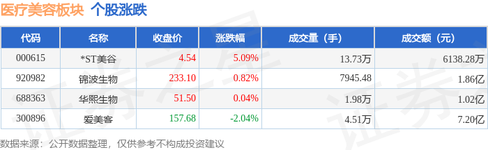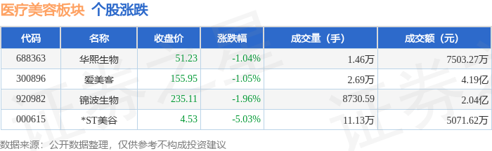 从资金流向上来看,当日医疗美容板块主力资金净流入1.04亿元,游资资金净流出3500.19万元,散户资 金净流出6874.66万元。医疗美容板块个股资金流向见下表: | 代码 | | | 名称 | | | | | --- | --- | --- | --- | --- | --- | --- | | 300896 爱美客 | 1.32亿 | 10.22% | -5008.75万 | -3.87% | -8233.60万 | -6.36% | | 688363 华熙生物 | -1074.40万 | -9.17% | 276.77万 | 2.36% | 797.64万 | 6.81% | | 000615 *ST美谷 | -1793.10万 | -18.27% | 1231.79万 | 12.55% | 561.30万 | 5.72% | 证券之星消息,11月11日医疗美容板块较上一交易日上涨1.68%,爱美客领涨。当日上证指数报收于 4002.76,下跌0.39%。深证成指报收于13289.0,下跌1.03%。医疗美容板块个股涨跌见下表: 以上内容为证券之星据公开信息整理,由AI算法生成(网信算备3101043 ...