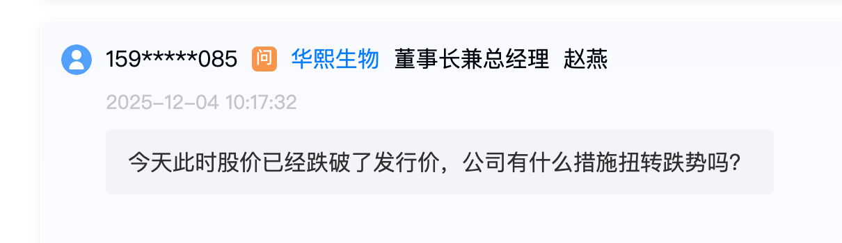 记者丨李益文 12月4日,玻尿酸龙头华熙生物(688363.SH)举行2025年第三季度业绩说明会期间,公司股价震荡下跌,盘中一度跌至45.25元/ 股(后复权47.62元/股),较发行价47.79元/股破发。 行业竞争格局的变化更让华熙生物承压。今年5月,作为玻料酸龙头的华熙生物与巨子生物就"透明质酸是否过时"展开激烈争 论,华熙生物在官方公众号发文称,重组胶原蛋白概念是资本构建的题材"幻象",强调透明质酸在衰老干预中的关键地位。但 市场趋势似乎偏向后者,弗若斯特沙利文数据预测,2026年基于胶原蛋白的皮肤护理市场份额将超过透明质酸,年复合增长率 达52.6%,2027年国内胶原蛋白整体市场规模将达1738亿元。 面对多重压力,华熙生物表示,公司已推出组织架构变革,管理团队已重回业务一线。同时,公司也在战略性前沿领域持续投 入,基于合成生物技术平台研发的PDRN、麦角硫因等新一代生物活性物质,有望为公司2026年原料业务业绩带来增量空间。 会上,有投资者直言:"今天此时股价已经跌破了发行价,公司有什么措施扭转跌势吗?"对此,华熙生物董事长兼总经理赵燕 回应称,我们理解投资者对于股价跌破发行价的关切,公司管理 ...