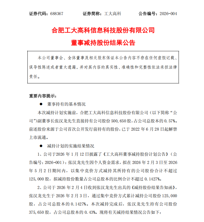 2月4日,工大高科(688367.SH)发布公告,披露公司副董事长张汉龙减持股份的结果。 图源:上市公司公告 据公告,公司于 2026 年 2 月 4 日收到张汉龙先生出具的《减持股份结果告知函》,张汉龙先生于 2026 年 2 月 3 日,通过集中竞价方式累计减持公司股份125,000股,占公司总股本的 0.1427%,减持价格区 间为36.5~37元/股,减持总金额4,590,000元。 本次减持计划实施前,张汉龙先生持有合肥工大高科信息科技股份有限公司500,650股,占公司总股本 的0.57%。本次次减持完成后,张汉龙先生持有公司股份375,650 股,占公司总股本的0.43%。 ...