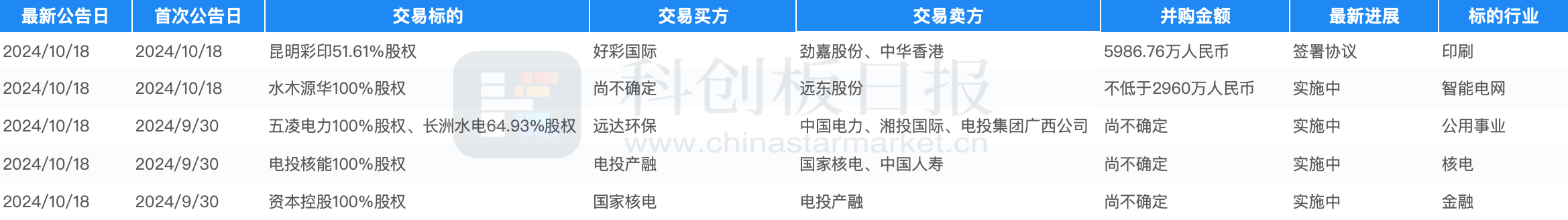 《科创板日报》10月18日讯 今日并购日报主要内容包括:劲嘉股份转让控股子公司昆明彩印股权;远东股份拟公开挂牌转让水木源 华100%股权。 今日的并购事件有: 劲嘉股份:转让控股子公司昆明彩印股权 劲嘉股份公告,公司与好彩国际、中华香港、昆明彩印签署《转让协议》,公司、中华香港分别将持有 昆明彩印的10%、41.61%股权转让给好彩国际,合计股权转让价款为5986.76万元。本次交易完成后, 公司不再直接或间接持有昆明彩印股权。好彩国际与公司及公司前十大股东不存在关联关系。 远东股份:拟公开挂牌转让水木源华100%股权 远东股份公告,公司拟在无锡产权交易所有限公司以公开挂牌方式,转让全资子公司水木源华电气有限 公司(简称"水木源华")100%股权,首次公开挂牌转让底价不低于2960万元。 远达环保:拟购买五凌电力100%股权和长洲水电64.93%股权 远达环保披露重大资产重组预案,公司拟通过发行股份及支付现金的方式,购买五凌电力有限公司(简 称"五凌电力")100%股权以及国家电投集团广西长洲水电开发有限公司(简称"长洲水电")64.93%股 权,并募集配套资金。标的资产评估值及交易价格均尚未确定。此次交易后 ...