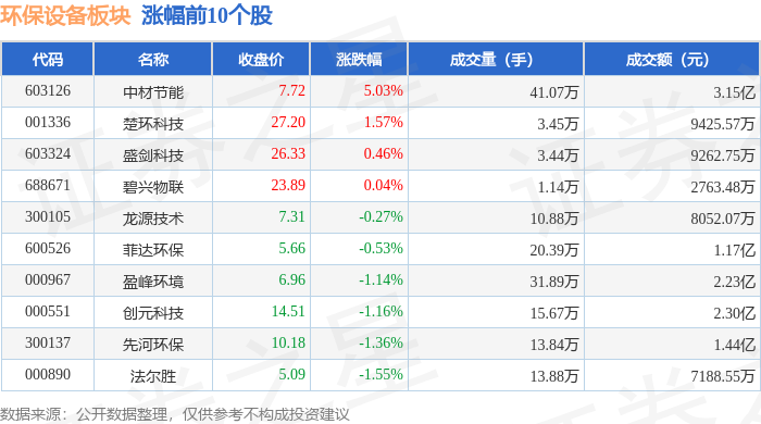 | 代码 | 名称 | 收盘价 | 涨跌幅 | 成交量(手) | 成交额(元) | | --- | --- | --- | --- | --- | --- | | 000820 | *ST节能 | 3.83 | -4.96% | 8.02万 | 3088.64万 | | 920145 | 恒合股份 | 18.79 | -2.79% | 1.29万 | 2402.12万 | | 002658 | 雪迪龙 | 10.19 | -2.39% | 31.42万 | 3.18亿 | | 300631 | 久吾高科 | 30.70 | -1.92% | - 3.38万 | 1.03亿 | | 300203 | 聚光科技 | 16.16 | -1.58% | 10.07万 | 1.61亿 | | 300105 | 龙源技术 | 7.54 | -1.44% | 10.61万 | 7931.77万 | | 603126 | 中材节能 | 7.32 | -1.21% | 10.82万 | 7890.36万 | | 603282 | 亚米股份 | 21.63 | -1.19% | 3.07万 | 6570.09万 | | 3010 ...