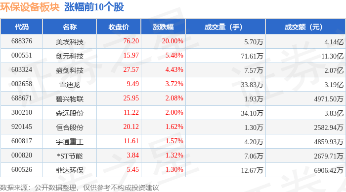 证券之星消息,1月16日环保设备板块较上一交易日上涨1.83%,美埃科技领涨。当日上证指数报收于 4101.91,下跌0.26%。深证成指报收于14281.08,下跌0.18%。环保设备板块个股涨跌见下表: | 代码 | 名称 | 收盘价 | 涨跌幅 | 成交量(手) | 成交额(元) | | --- | --- | --- | --- | --- | --- | | 688376 | 美埃科技 | 76.20 | 20.00% | 5.70万 | 4.14亿 | | 000551 | 创元科技 | 15.97 | 5.48% | 71.61万 | 11.30亿 | | 603324 | 盛剑科技 | 27.57 | 4.43% | 7.57万 | 2.07亿 | | 002658 | 雪迪龙 | 9.49 | 3.72% | 1 33.83万 | 3.19亿 | | 688671 | 碧兴物联 | 25.95 | 2.08% | 1.93万 | 4971.50万 | | 300210 | 蒜元股份 | 11.22 | 2.00% | 34.10万 | 3.83亿 | | 920145 | 恒合股份 | 20 ...
