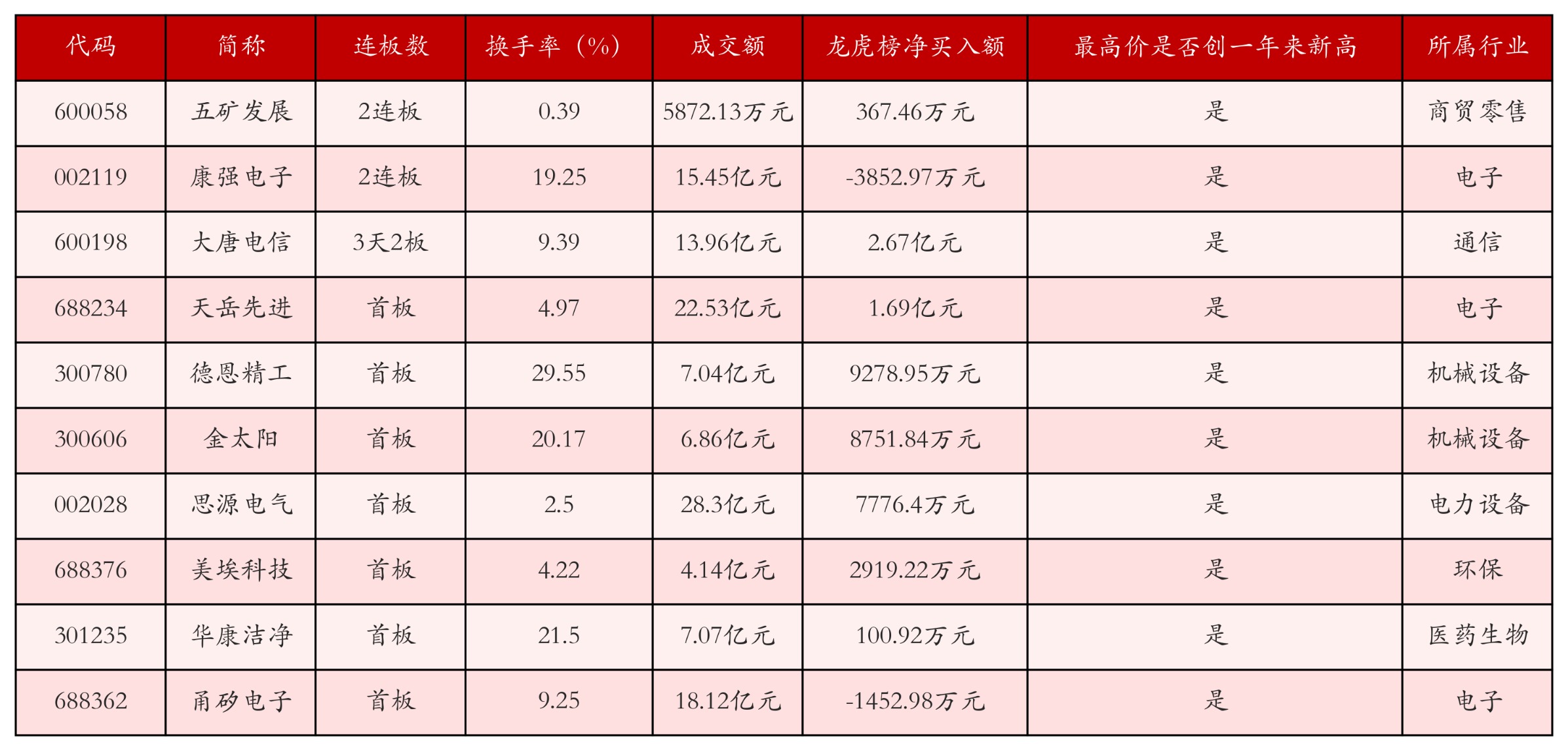 一、强势个股 截至1月16日收盘,上证综指下跌0.26%,收于4101.91点,深证成指下跌0.18%,收于14281.08点,创业板指下跌0.2%,收于3361.02点。今日沪深两市A股共 计67只涨停,综合当前连板数以及当日龙虎榜数据,其中较为强势的前三只个股分别为:五矿发展(600058)、康强电子(002119)与大唐电信 (600198)。今日强势个股前10位具体数据见下表: | 代码 | 简称 | 连板数 | 换手率 (%) | 成 | | --- | --- | --- | --- | --- | | 600058 | 五矿发展 | 2连板 | 0.39 | 5872. | | 002119 | 康强电子 | 2连板 | 19.25 | 15.4 | | 600198 | 大唐电信 | 3天2板 | 9.39 | 13.9 | | 688234 | 天岳先进 | 首板 | 4.97 | 22.5. | | 300780 | 德恩精工 | 首板 | 29.55 | 7.04 | | 300606 | 金太阳 | 首板 | 20.17 | 6.86 | | 002028 | 思源电气 | 首板 | ...