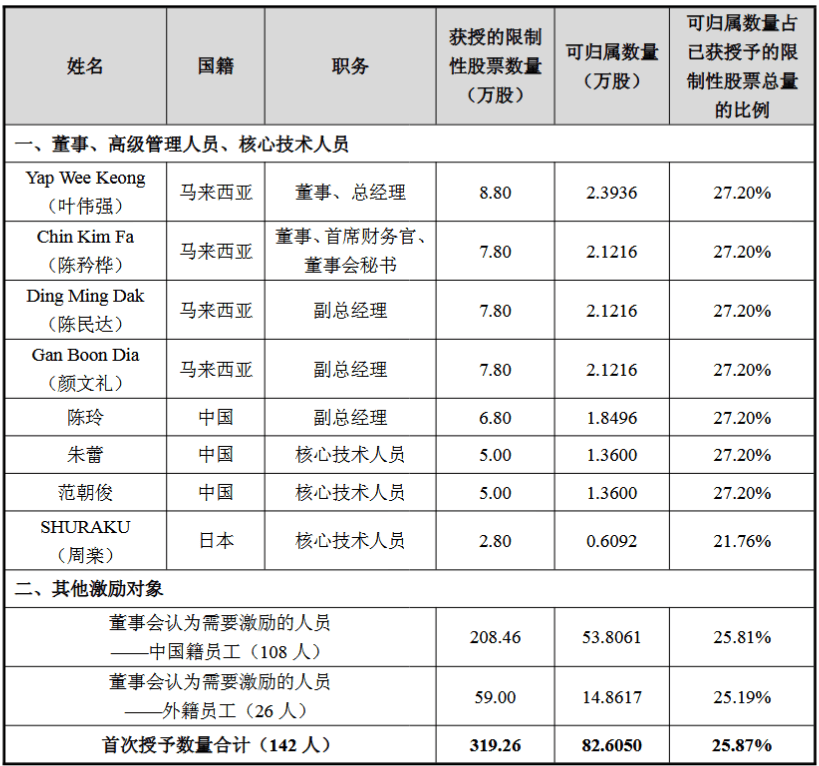 Core Points - The announcement from Meiyetech (688376) details the results of the first vesting period for its 2024 restricted stock incentive plan, with 830,000 shares set to be listed for trading on November 26, 2025 [1] - A total of 142 individuals are involved in this incentive plan, with a total of 319.26 million shares granted, of which 82.605 million shares are eligible for vesting [1] Summary by Category Incentive Plan Details - The incentive plan includes 142 participants, with specific allocations for key personnel such as directors and senior management [1] - The total number of shares granted to the participants is 319.26 million, with 82.605 million shares eligible for vesting, representing 25.87% of the total granted shares [1] Individual Allocations - Key individuals include Yap Wee Keong (2.3936 million shares), Chin Kim Fa (2.1216 million shares), and Ding Ming Dak (2.1216 million shares), each receiving 27.20% of their granted shares [1] - Other notable allocations include Chen Ling (1.8496 million shares) and Zhu Lei (1.3600 million shares), both receiving 27.20% of their granted shares [1] Financial Performance - For the first three quarters of 2025, Meiyetech reported revenues of 1.486 billion yuan and a net profit attributable to shareholders of 141 million yuan [1]