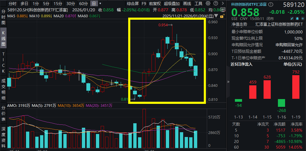 创新药板块承压,益方生物等跌超3%,科创创新药ETF汇添富(589120)跌超2%,资金逆势涌入!"全球创新药春晚"JPM召开,中国创新药闪耀全球