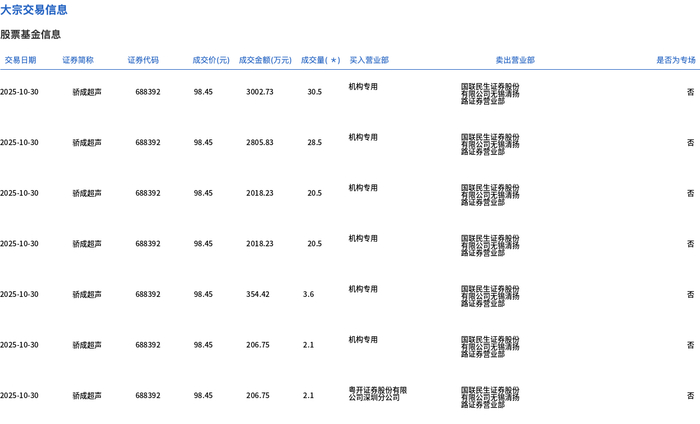 Summary of Key Points Core Viewpoint - On October 30, a significant block trade of 1.078 million shares of Jiao Cheng Ultrasound was executed, amounting to 106 million yuan, which represented 17.57% of the total trading volume for that day. The transaction price was 98.45 yuan, reflecting a discount of 10.09% compared to the market closing price of 109.5 yuan [1]. Group 1: Trading Details - The block trade involved multiple institutional buyers, with the transaction price consistently at 98.45 yuan across different trades [2]. - The total transaction amount for the block trade was approximately 10.6 million yuan, with the volume reaching 1.078 million shares [1][2]. - The discount of 10.09% from the market closing price indicates a notable price deviation, which may attract investor interest [1].