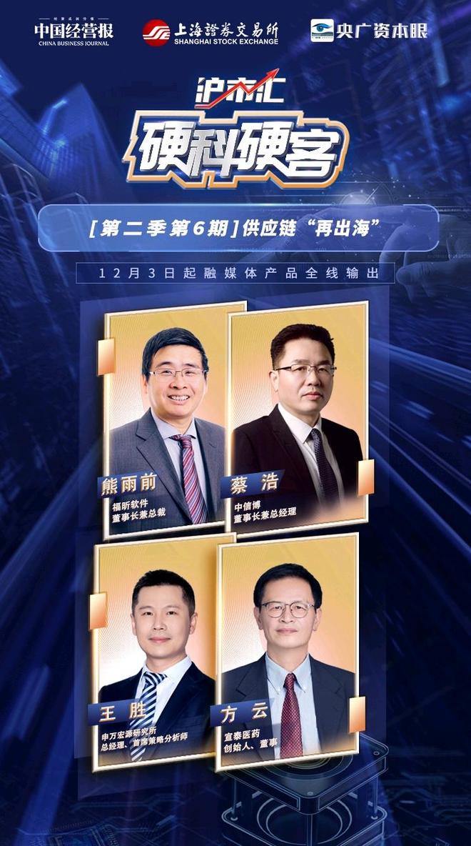 ● 央广资本眼 中国经营报 TE LANGHAI STOCK EXCHANGE CHINA BUSINESS IOURNAL HP 77 [第二季第6期]供应链"再出海" 1 2 月 3 日 起 融 媒 体 产 品 全 线 输 出 IBA EU 中信博 事长兼总集 董事长兼总经理 申万家 度暗分析师 d 修理 《沪市汇·硬科硬客》第二季第6期"供应链'再出海'"即将开播上线。 中信博董事长兼总经理蔡浩,福昕软件董事长兼总裁熊雨前,宣泰医药创始人、董事方云等科创板"出 海"龙头企业嘉宾,共同探讨供应链"再出海"话题。这不再是一个"要不要做"的选答题,而是一道"如何 做好"的必答题。 e ...