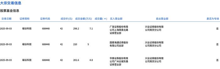 9月3日,磁谷科技大宗交易成交16.9万股,成交额709.8万元,占当日总成交额的4.78%,成交价42元, 较市场收盘价47.67元折价11.89%。 | 交易日期 | 豆醇圆移 | 证券代码 | | | 成交价(元) 成交金额(万元) 成交量(*) 买入营业部 | | 奥运营业部 | 是否为专场 | | --- | --- | --- | --- | --- | --- | --- | --- | --- | | 2025-09-03 | 圆谷科技 | 683448 | 42 | 298.2 | 7.1 | 广发适劳脸份有限 公司上海南泉北路 还要营业部 | 兴业证券股份有限 公司南京分公司 | Na | | 2025-09-03 | 磁谷科技 | 688448 | 42 | 210 | 5 | 国泰海通证券股份 有限公司总部 | 兴业证券股份有限 公司局京分公司 | KA | | 2025-09-03 | 磁谷科技 | 688448 | 42 | 201.6 | 4.8 | 华泰证券股份有限 公司广州云城东路 证券需求能 | 兴业证券股份有限 公司南京分公司 | KO | ...