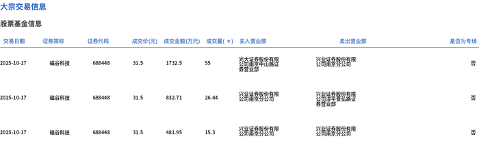 磁谷科技现3笔大宗交易 均为折价成交