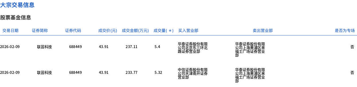 | 交易日期 | 证券简称 | 证券代码 | 成交价(元) | | 成交金额(万元) 成交量(*) 买入营业部 | | | 卖出营业部 | | --- | --- | --- | --- | --- | --- | --- | --- | --- | | 2026-02-06 | 联芸科技 | 688449 | 43.16 | 345.28 | 8 | 机构专用 | | | | 2026-02-06 | 联芸科技 | 688449 | 43.16 | 315.07 | 7.3 | | | | | 2026-02-06 | 联芸科技 | 688449 | 43.16 | 315.07 | 7.3 | 国都证索埃公有限 | | | | 2026-02-06 | 联芸科技 | 688449 | 43.16 | 315.07 | 7.3 | | | | | 2026-02-06 | 联芸科技 | 688449 | 43.16 | 315.07 | 7.3 | | | | | 2026-02-06 | 联芸科技 | 688449 | 43.16 | 233.06 | 5.4 | | | | | 2026-02-06 | ...