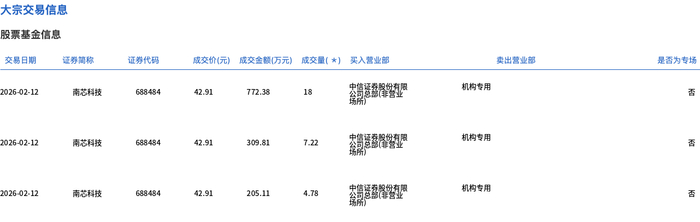 | 交易日期 | 证券简称 | 证券代码 | | | 成交价(元) 成交金额(万元) 成交量(*) 买入营业部 | | 类出管业部 | 是否为专场 | | --- | --- | --- | --- | --- | --- | --- | --- | --- | | 2026-02-12 | 南芯科技 | 688484 | 42.91 | 772.38 | 18 | 公司有限公司。 | 机构专用 | Ka | | 2026-02-12 | 南芯科技 | 688484 | 42.91 | 309.81 | 7.22 | 2012017 | 机构专用 | ки | | 2026-02-12 | 南芯科技 | 688484 | 42.91 | 205.11 | 4.78 | 第一次第一次 | 机构专用 | 증 | 2月12日,南芯科技大宗交易成交30万股,成交额1287.3万元,占当日总成交额的5.91%,成交价42.91 元,较市场收盘价43.34元折价0.99%。 ...