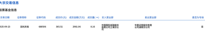 | 交易日期 | | 证券代码 ----- | 成交价(元) 成交金额[万元) 成交量(*) 买入营业部 | | 卖出营业部 | 是否为专场 | | --- | --- | --- | --- | --- | --- | --- | | 025-09-23 | 百利天恒 | 688506 | 365.51 2981.06 | 8.16 字圆因写主赌努型 | 悉喬攝霧勢怒寫甲 | 190 | 9月23日,百利天恒大宗交易成交8.16万股,成交额2981.06万元,占当日总成交额的5.49%,成交价 365.51元,较市场收盘价365.51元持平。 ...