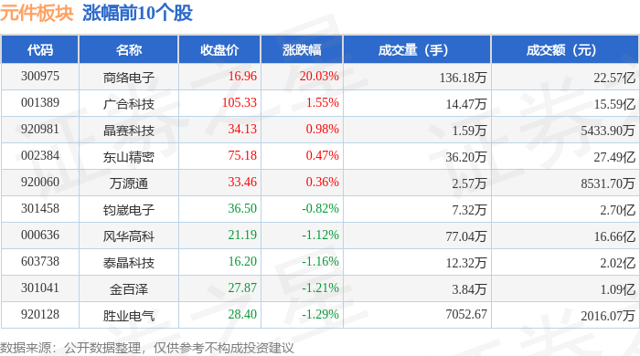从资金流向上来看,当日元件板块主力资金净流出57.67亿元,游资资金净流入8.93亿元,散户资金净流 入48.74亿元。元件板块个股资金流向见下表: | 代码 | 名称 | 主力净流入(元) | 主力净占比 游资净流入 (元) | | 游资净占比 散户净流入 (元) | | 散户净占比 | | --- | --- | --- | --- | --- | --- | --- | --- | | 300975 商络电子 | | 3.60 Z | 15.97% | -2.00 Z | -8.86% | -1.61 Z | -7.12% | | 002384 | | 1.02亿 | 3.70% | 3815.62万 | 1.39% | -1.40 Z | -5.09% | | 301458 钧崴电子 | | 2185.09万 | 8.09% | 596.98万 | 2.21% | -2782.07万 | -10.30% | | 603738 泰晶科技 | | 1213.01万 | 6.01% | -439.74万 | -2.18% | -773.27万 | -3.83% | | 920981 晶赛科技 | | 435 ...