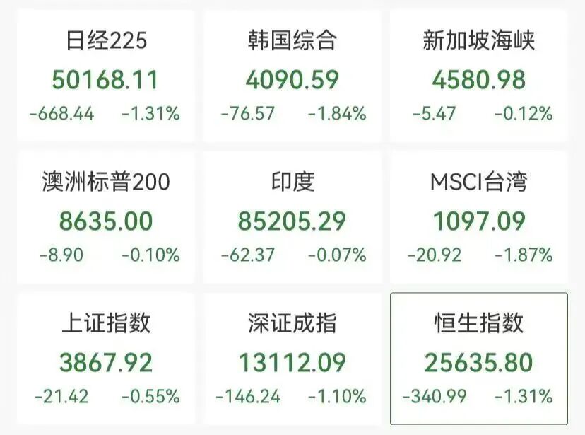 12月15日,亚太主要股指收盘多数下跌,日经225指数、韩国KOSPI指数均跌超1%,A股三大指数集体飘绿,港股恒 生指数下挫。黄金白银强势上涨,铂金表现亮眼,年内涨幅已超过100%。 | 日经225 | 韩国综合 | 新加坡海峡 | | --- | --- | --- | | 50168.11 | 4090.59 | 4580.98 | | -668.44 -1.31% -76.57 -1.84% | | -5.47 -0.12% | | 澳洲标普200 | 印度 | MSCI台湾 | | 8635.00 | 85205.29 | 1097.09 | | -8.90 -0.10% -62.37 -0.07% | | -20.92 -1.87% | | 上证指数 | 深证成指 | 恒生指数 | | 3867.92 | 13112.09 | 25635.80 | | -21.42 -0.55% -146.24 -1.10% | | -340.99 -1.31% | 具体来看,A股全天震荡调整,沪指盘中翻红后回落,创业板指低开低走。沪深两市成交额1.79万亿元,较上一个交 易日缩量3246亿元。 盘面上,市场热点 ...